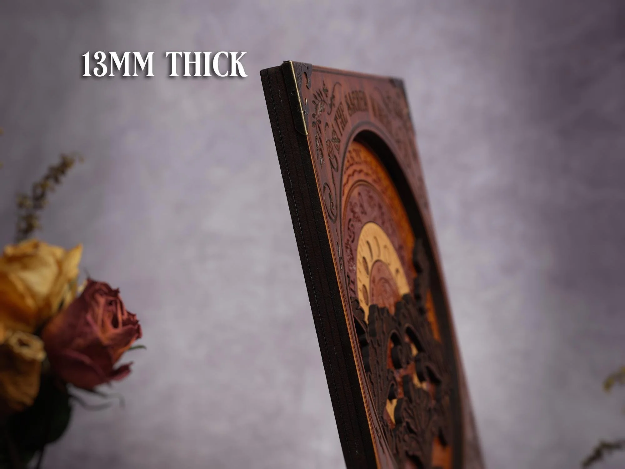 The front panel of the piece features various pieces of both Wiccan and Pagan iconography (including pentagrams, goddess icons, knots of protection, triskele and more, and the four brass style corner pieces really finish off this piece.